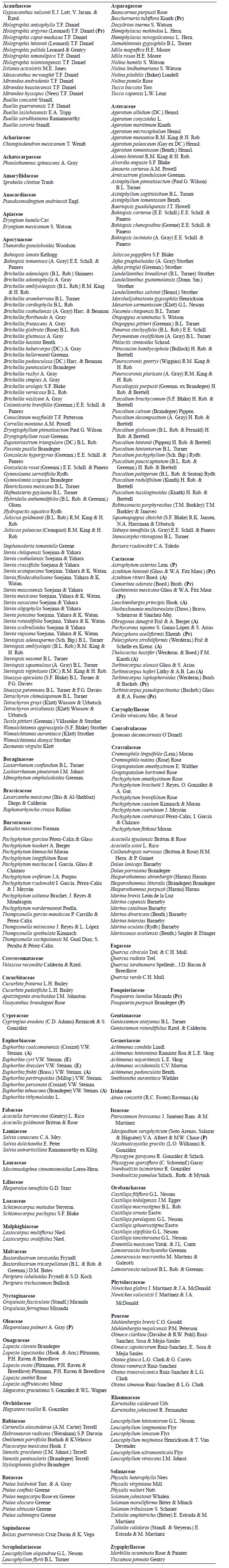 Microendemic species of the Mexican lineages of angiosperms. These are restricted to a single quadrat. Species that are on the Mexican Red List (Anonymous, 2010) are indicated with the following designations in parentheses: A = threatened, P = endangered, Pr = under special protection.