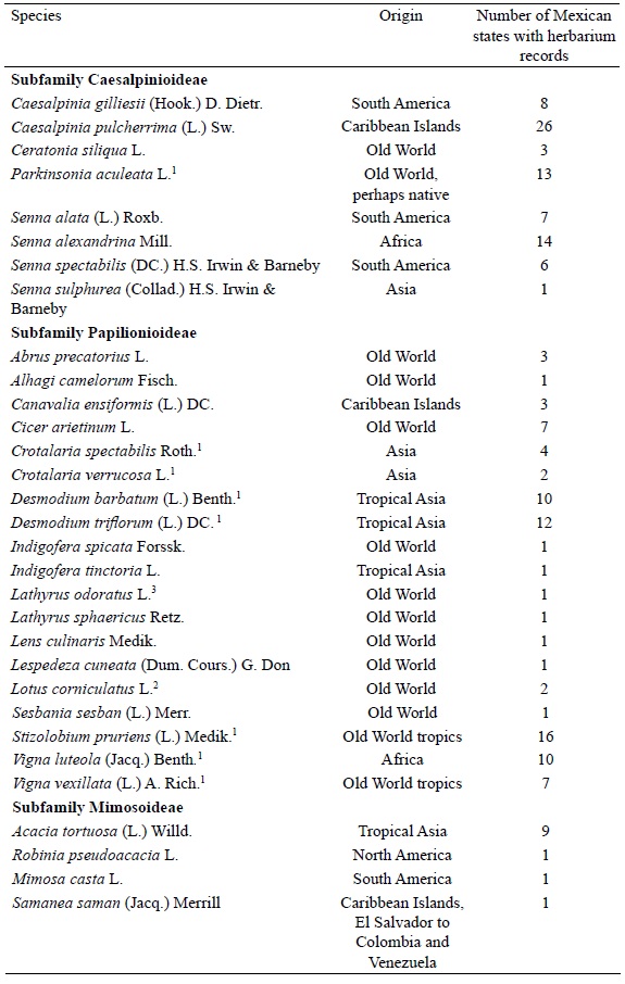 Leguminosae adventive species not included in the analysis performed in this work. List obtained from Villaseñor and Espinosa-García (2004); Espinosa-García et al. (2009); Blanco Fernández de la Caleya et al. (2010); Mario Sousa S1 (personal communication); Williams (2010)2; Vibrans (2009)3.