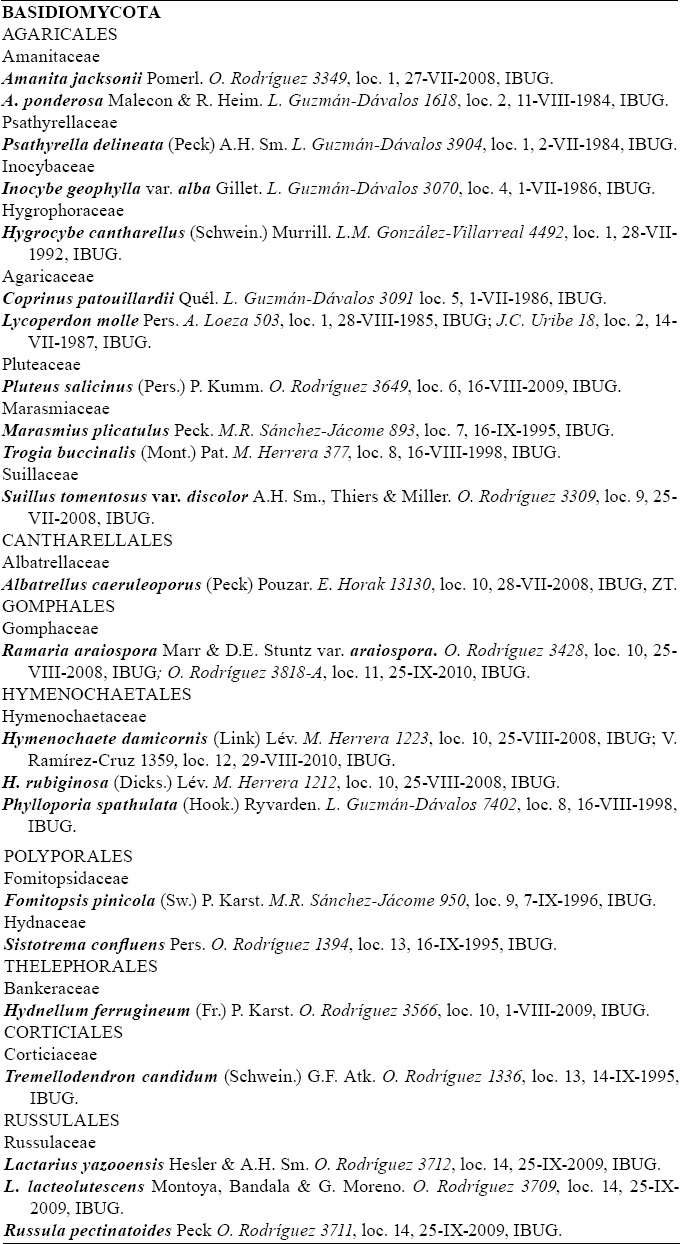 Lista de especies que se registran por primera vez para Jalisco; se anotan los especímenes estudiados, la localidad, número de colección, fecha y herbario.