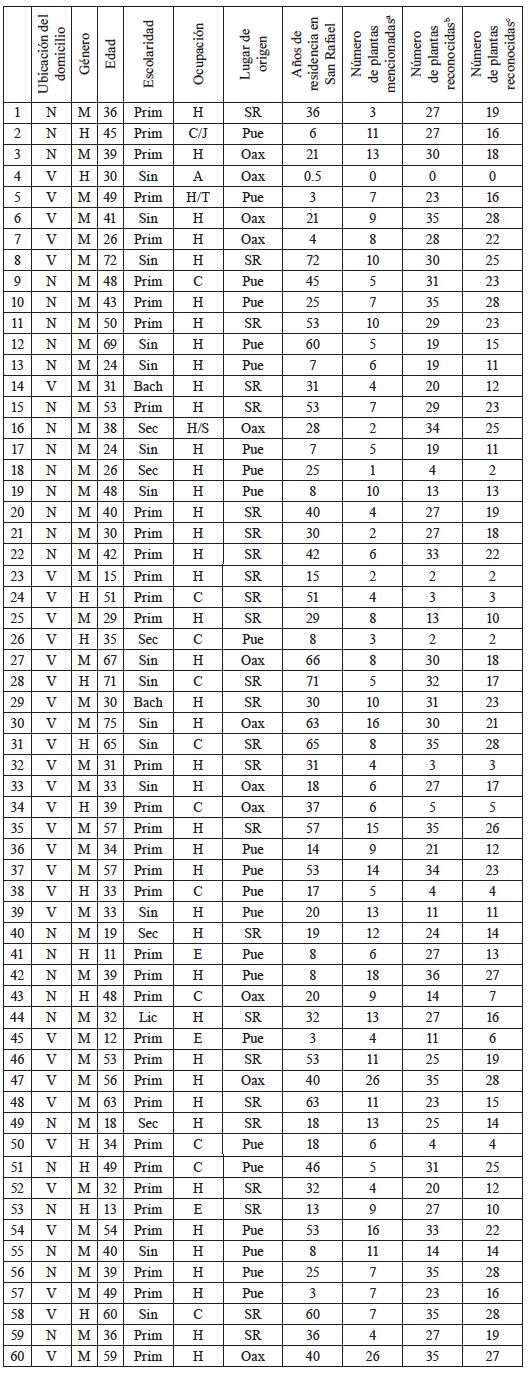Apéndice 1. Datos personales de los informantes entrevistados y número de especies mencionadas y reconocidas. Ubicación del domicilio: N parte nueva; V parte vieja del poblado. Género: M: mujer; H: hombre. Escolaridad: Sin: sin escolaridad; Prim: primaria; Sec: secundaria; Bach: bachillerato; Lic: licenciatura. Ocupación: H: hogar; C: campesino; A: albañil; T: tienda; J: juez; S: casa de salud; E: estudiante. Lugar de origen: SR: San Rafael; Pue: estado de Puebla; Oax: estado de Oaxaca. aPlantas mencionadas en la entrevista abierta. bPlantas reconocidas sólo por el nombre durante la entrevista estructurada. cPlantas reconocidas como medicinales (nombre y uso) durante la entrevista estructurada.
