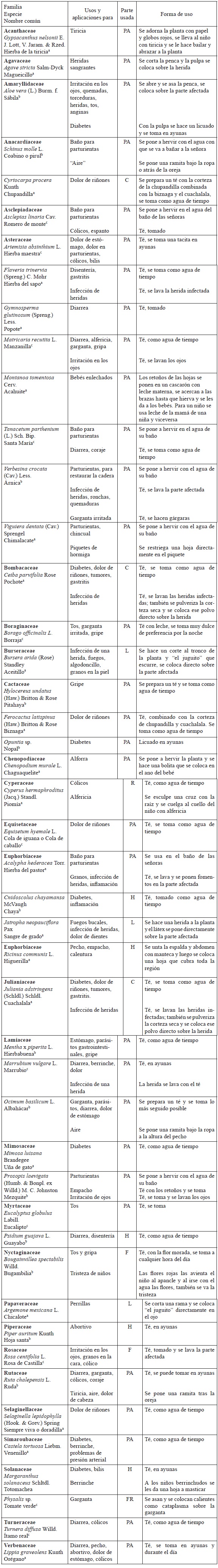 Apéndice 2. Especies usadas en la medicina tradicional de San Rafael. aPlantas silvestres (47.8%). bPlantas cultivadas en los huertos (28.2%). cPlantas adquiridas en los mercados (23.9%). Parte usada: C: corteza; F: flor; FR: fruto; H: hojas; L: látex; PA: parte aérea; R: raíz.