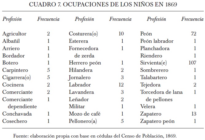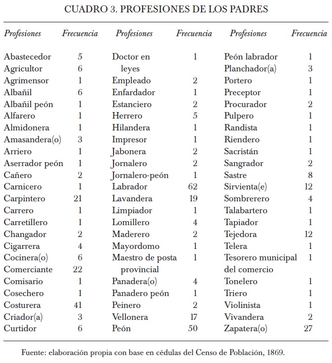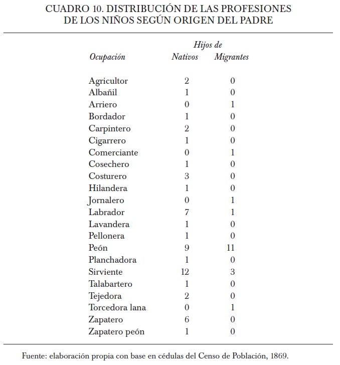 74 Recordemos que el número de niños muestreados en 1869 y encontrados en las cédulas de 1895 asciende a 262, de los cuales 21 no registran profesión (20 mujeres y un varón); de quince de 21 niños recopilamos información adicional de las cédulas (profesión del marido) y los ubicamos en una categoría socioeconómica. De esta manera fue posible asignarles una posición en la escala social a 256 personas encontradas en 1895.