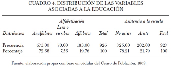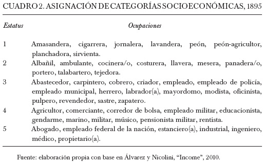 Siguiendo a Fernández, se incluyó a cigarreras, amasanderas, limpiadoras, lavanderas y planchadoras dentro de la categoría más baja dados los niveles de instrucción nulos y la baja nupcialidad en relación con otras ocupaciones de poca calificación como costureras, pelloneras, hilanderas y tejedoras, que fueron incluidas en la categoría baja.56