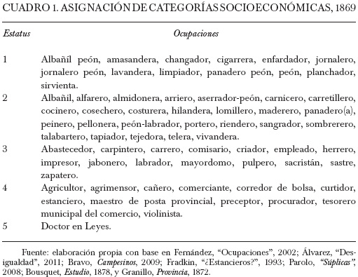 En la categoría alta se ubicó a agrimensores, procuradores, educacionistas, maestro de posta provincial, tesorero municipal del comercio, violinista y corredor de bolsa (cuadro 1).