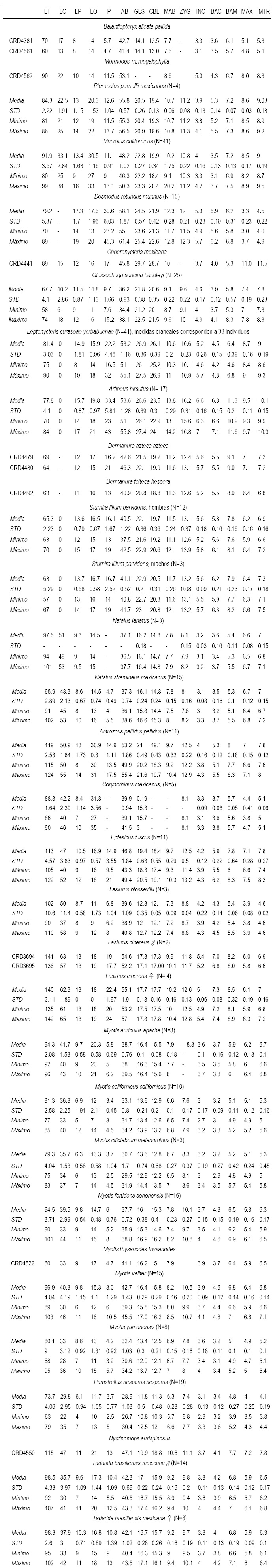 Medidas somáticas y craneales para muestras de murciélagos de la Sierra Tarahumara, Chihuahua, México. Los acrónimos se dan en material y métodos.