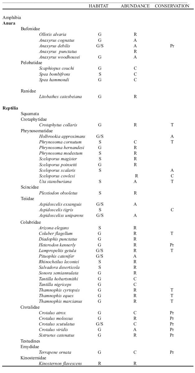 Species of reptiles and amphibians recorded in the Janos-Casas Grandes region, Chihuahua, Mexico. HABITAT: G, grassland; S, scrubland; R, riparian. ABUNDANCE: R: rare; C: common; A, abundant. CONSERVATION (NOM 059, SEMARNAT, 2003): T =threatened; Pr = Under special protection. Taxonomy follows those of Flores Villela (1993); Flores Villela y Canseco Márquez, (2004), Frost (2007), and Liner (2007).
