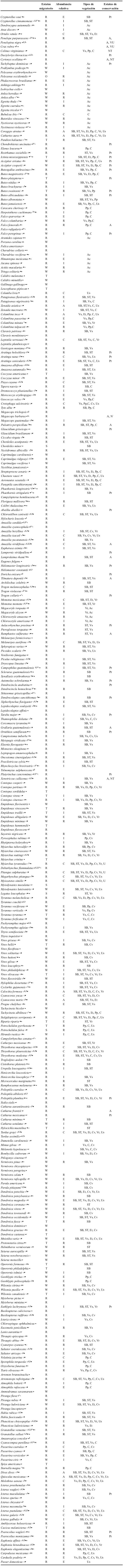 Listado de la avifauna registrada en 24 sitios de muestreo ubicados en la Depresión Central de Chiapas de 2003 al 2004. El orden taxonómico se basa en AOU (2008). Estatus migratorio: residente (R), visitante de invierno (W), residente de verano (S), transitoria (T). Abundancia relativa: rara (R), no común (I), moderadamente común (E), común (C), abundante (A). Tipo de vegetación: SB (selva baja caducifolia), Pp (pastizal/potrero), Cv (cercos vivos), Vr (vegetación riparia), ST (selva mediana subperennifolia), Vs (vegetación secundaria), C (cultivo), Et (encinar tropical), Us (zona urbana y suburbana, incluye parques y centros de recreación) y Ac (acuáticas y subacuáticas). Estatus de conservación: NOM-059-SEMARNAT-2001 (Pr, bajo protección especial; A, amenazada; P, en peligro de extinción), IUCN (NT, casi amenazada; VU, vulnerable). 1 Especie endémica a Mesoamérica; 2 Especie endémica al oeste de México;3 Especie asociada a la selva baja caducifolia. •Registros obtenidos de colecciones y/o literatura para los sitios de estudio, cuya presencia no fue corroborada en este estudio.