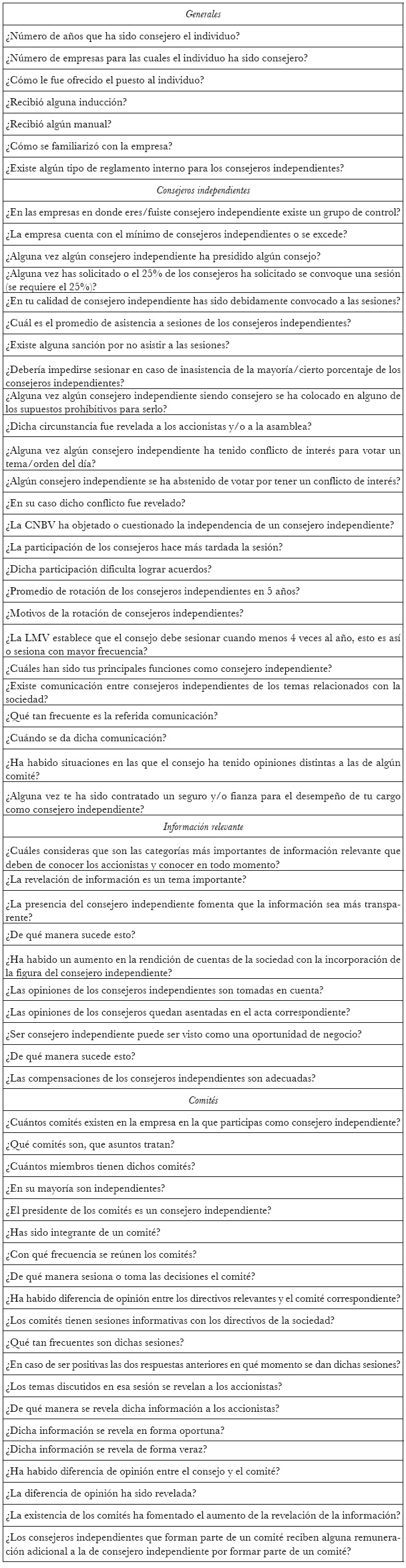 A continuación se presentan las preguntas que estructuraron las entrevistas realizadas a los consejeros independientes. Para una fácil revisión, las preguntas se presentan por temas.