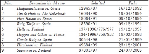 Se revisó el contenido de 11 fallos emitidos por la Corte de Estrasburgo durante el periodo comprendido de 1992 a 2003. Sin embargo, sólo nueve de ellos se refieren directamente a la motivación de decisiones judiciales, por lo que fueron condensados para mejor comprender sus aspectos concretos y la solución que se le dio a los conflictos que entrañaban.