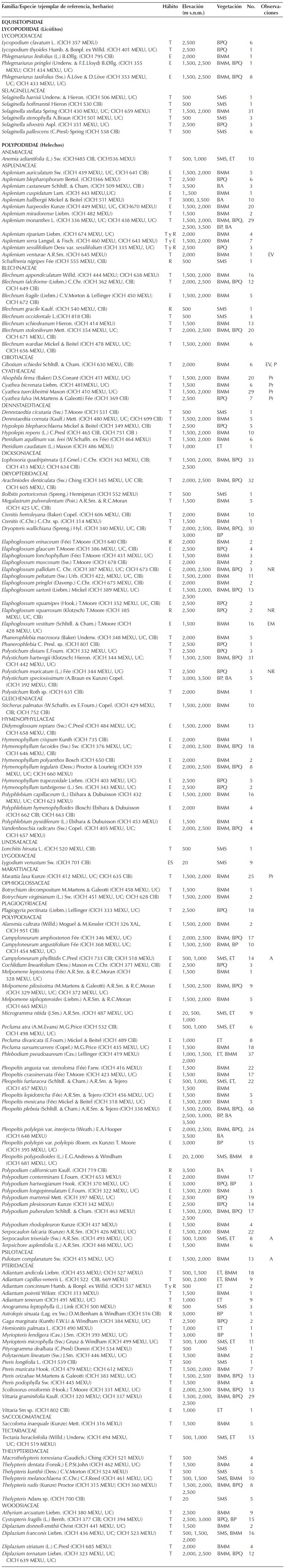 Apéndice 1. Relación de especies de helechos y licófitos registradas a lo largo del gradiente altitudinal del Cofre de Perote, centro de Veracruz, México. Colector: César I. Carvajal-Hernández (CICH); Herbario: MEXU: Instituto de Biología, UNAM; UC: Universidad de California-Berkeley; CIB: Instituto de Investigaciones Biológicas, Universidad Veracruzana y XAL: Instituto de Ecología, A.C.; Hábito (T: terrestre; E: epífito; R: rupícola; ES: escandente); Vegetación: tipo de vegetación (BA: bosque de Abies; BP: bosque de Pinus; BPQ: bosque de Pinus-Quercus; BMM: bosque mesófilo de montaña; ET: bosque tropical de Quercus o encinar tropical; SMS: selva mediana subcaducifolia); No.: número de parcelas donde la especie fue registrada; Observaciones (EV: endémica a Veracruz; EM: endémica a México; NR: nuevo registro para Veracruz; Categorías de riesgo de acuerdo a la NOM-059-Semarnat-2010: P: en peligro; Pr: sujeta a protección especial; A: amenazada).
