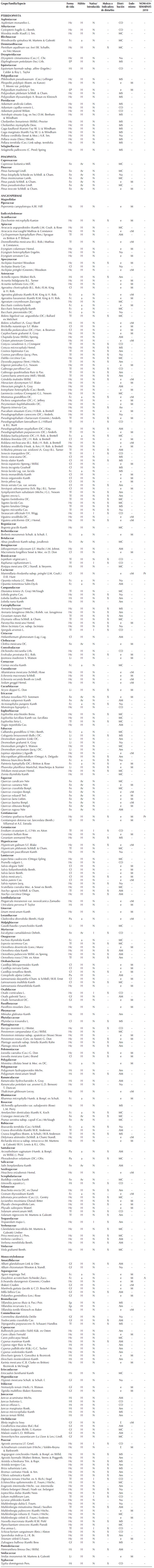 Apéndice. Catálogo de las plantas vasculares de la Sierra el Rincón, Querétaro y Michoacán, México. FORMAS DE VIDA Cf = caméfita, Ep = epífita, Fc = fanerófita cespitosa, Fe = fanerófita escaposa, Gf = geófita, Hc = hemicriptófita, Hi = hidrófita, Li = liana, Pa = parásita, Tf = terófita; HÁBITO a = arbusto, Ar = árbol, H = Hierba; N = nativa, I = introducida; X = maleza o especie indicadora de disturbio; DISTRIBUCIÓN AM = amplia distribución en América, AN = México y las Antillas, CO = amplia distribución mundial, e = endémica a México, MC = de México a Centroamérica, MS = de México a Sudamérica, Na = de México a Norteamérica; ENDEMISMO cM = endémica al centro de México, M = de amplia distribución en México; ESTATUS DE CONSERVACIÓN DE ACUERDO A LA NOM-059-SEMARNAT-2010 A = amenazada, Pr = protección especial.