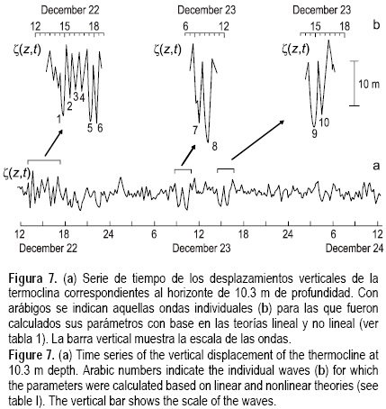 Los parámetros teóricos que describen el comportamiento de las ondas internas marcadas con arábigos en la figura 7 fueron calculados mediante la solución numérica de la ecuación (Miropol'sky 2001):