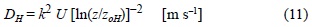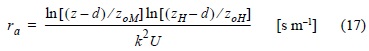 donde z es la altura de medición de la velocidad del viento [m] (12 m), d es la altura de desplazamiento del plano cero [m], zoM es la longitud de rugosidad para la cantidad de movimiento [m], ZH es la altura de medición de la temperatura del aire y humedad relativa [m], zoH es la longitud de rugosidad para transporte de calor sensible [m], k es la constante de von Kármán y U es la velocidad del viento [m]. Los valores de zoH y zoM para un suelo desnudo se tomaron de tablas (Kreith y Sellers 1975, Mailhot et al. 1998). Cabe hacer notar que d equivale a cero para el caso de un suelo desnudo (Kreith y Sellers 1975).