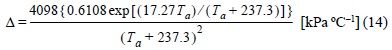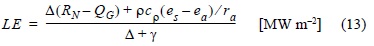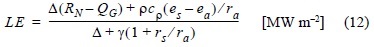 donde Δ es la pendiente de la curva temperatura vs. presión de vapor de saturación [kPa °C-1], ρ es densidad del aire [Kg m-3], cρ es el calor específico del aire [MJ Kg-1 °C-1], (es - ea) representa el déficit de presión de vapor del aire [kPa] (z = 3 m), ra es la resistencia aerodinámica [s m-1], rs es la resistencia superficial [s m-1] y γ es la constante psicrométrica [kPa °C-1].