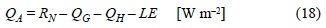 Se utilizaron diferentes fórmulas aerodinámicas de masa para estimar los flujos radiativos y turbulentos a partir de los datos meteorológicos disponibles. La radiación neta (RN) se determinó a partir de la radiación solar incidente y la temperatura usando (Evett 2002):