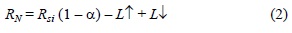 donde Rsi es la radiación solar incidente [W m-2], α es el albedo, L↑ es la radiación de onda larga terrestre (agua/sedimento) [W m-2] y L↓ es la radiación de onda larga atmosférica [W m-2].