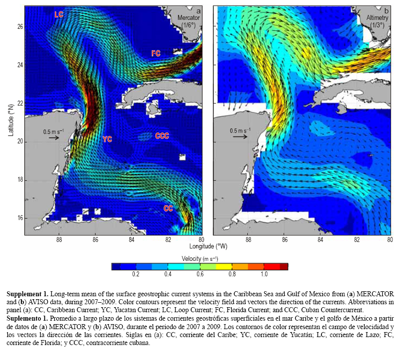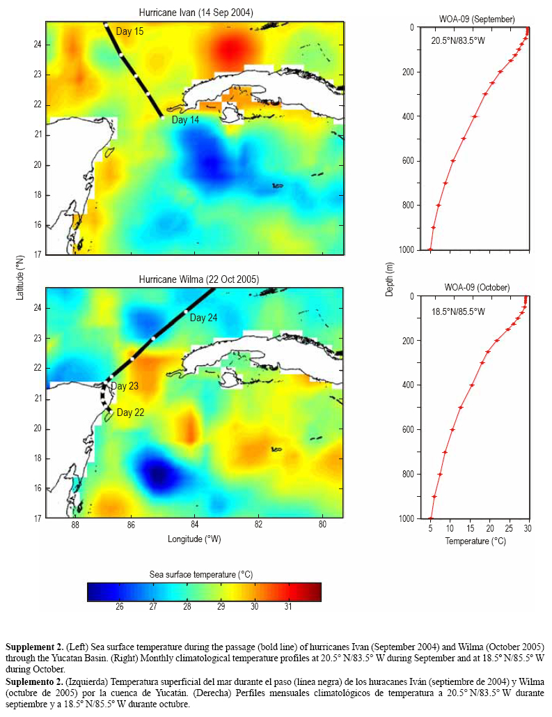 Para proporcionar evidencia de que los datos del modelo MERCATOR representan los patrones de circulación de la cuenca de Yucatán, mar Caribe, en el suplemento 1 se presenta un mapa superficial. Los resultados obtenidos con este modelo coinciden con la circulación general que muestran modelos oceánicos y datos in situ publicados para esta región (e.g., Johns et al. 2002, Centurioni y Niiler 2003, Romanou et al. 2004, Jouanno et al. 2008; ver el texto para las referencias). Además, para confirmar que se mezcló agua profunda más fría con agua superficial durante el paso de los huracanes, se incluyen mapas de la temperatura superficial del mar (TSM) durante el paso de los huracanes Iván y Wilma (suplemento 2). Estos mapas se basan en imágenes de TSM reconstruidas mediante interpolación óptima de los sensores Advanced Microwave Scanning Radiometer y Advanced Very High Resolution Radiometer. Para estimar la profundidad de donde provinieron estas aguas frías, se incluyen perfiles verticales climatológicos de temperatura media mensual para los meses que correspondieron al paso de los huracanes. Los datos de temperatura fueron tomados de Locarnini et al. (2010).
