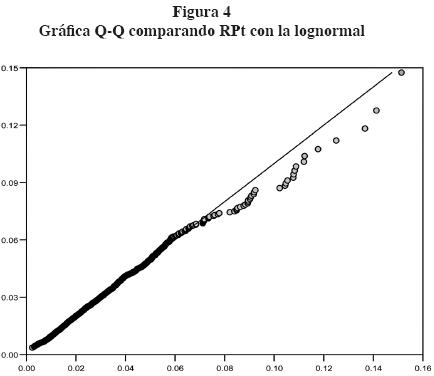 La distribución de frecuencias de los rangos se ajusta a una lognormal sin importar que éstos sean con observaciones diarias, semanales, quincenales o mensuales.