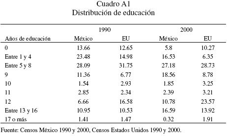 El cuadro A1 muestra las fracciones de la población que corresponden a cada grupo de mexicanos y para cada año con el que se cuenta. Un análisis detallado sobre la distribución de educación de mexicanos en México y en Estados Unidos se encuentra en Cuecuecha, González y Pederzini (2010).