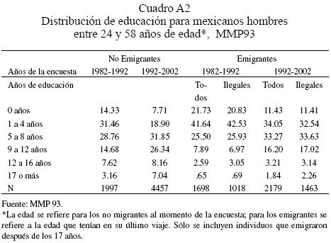 El cuadro A2 muestra la distribución de educación para los mexicanos que se encuentran en la encuesta MMP 93. La muestra incluye sólo hombres entre 24 y 58 años de edad que entraron a EU después de los 17 años. Se considera ilegales a todos los individuos que declaran en la encuesta haber cruzado a Estados Unidos sin un permiso de trabajo. El cuadro muestra al grupo de personas tomado de las muestra de 1982 a 1992 y al grupo de personas tomado de las encuestas de 1992 a 2002.