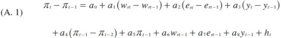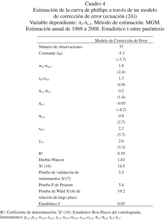 Este mecanismo de estimó por MGM para el mismo período 1969-2008 con el supuesto a3=0, pues el cambio en la brecha del producto fue muy poco significativo. No se consideraron posibles cambios estructurales. Los resultados fueron: