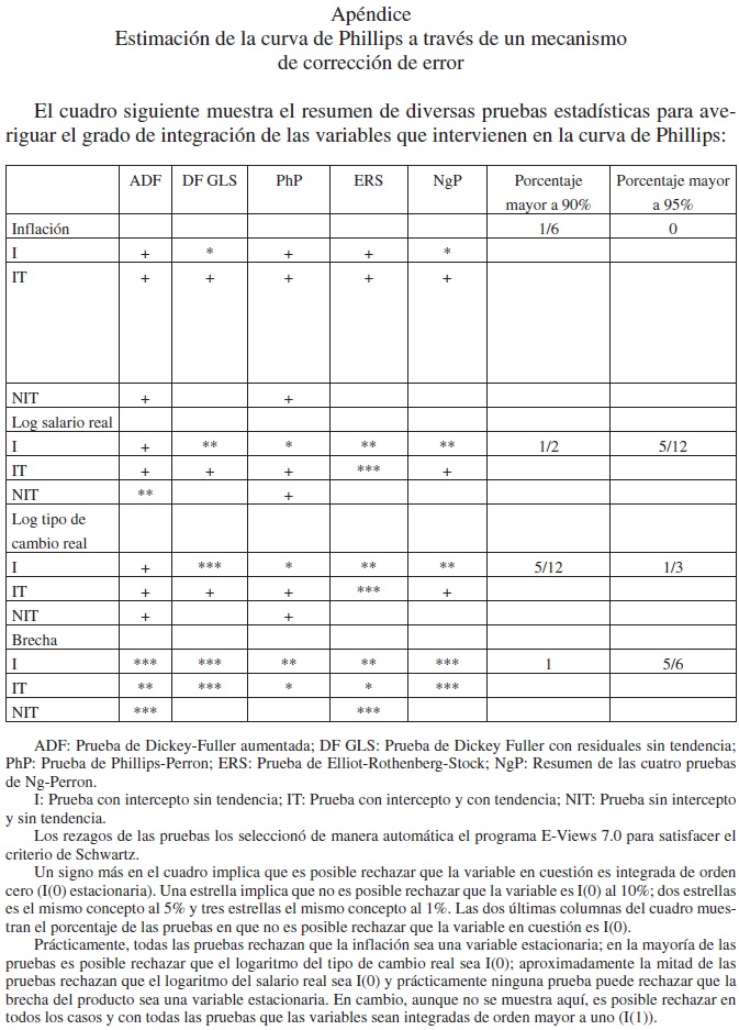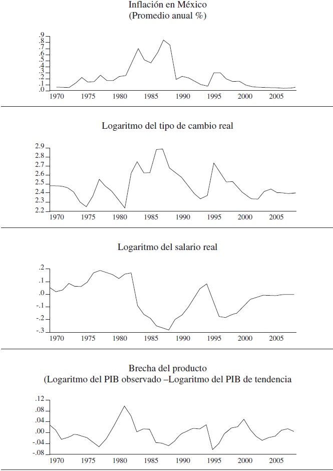 Se llevó a cabo una prueba de Dickey-Fuller aumentada (ADF(1)) con cambio estructural para la inflación y los logaritmos del salario real y el tipo de cambio real. Estas dos últimas variables resultaron I(0) al incluir una dummy en el intercepto a partir de 1982, año en que comenzó una de las mayores crisis económicas de México. La inflación resultó I(0) al incluir una dummy en el intercepto de la prueba ADF (1) a partir de 1990. Cabe señalar que, en el caso de incluir tendencia, todas las pruebas ADF con cambio estructural mostraron ausencia de raíces unitarias al 5% o menos. Al no incluir tendencia, las pruebas ADF rechazan raíces unitarias en el salario real y el tipo de cambio real al 5% y en la inflación al 10%. La brecha del producto resulta en todos los casos I(0) con o sin incluir dummies en las pruebas ADF. Por lo anterior, todas las series consideradas podrían ser de hecho estacionarias.