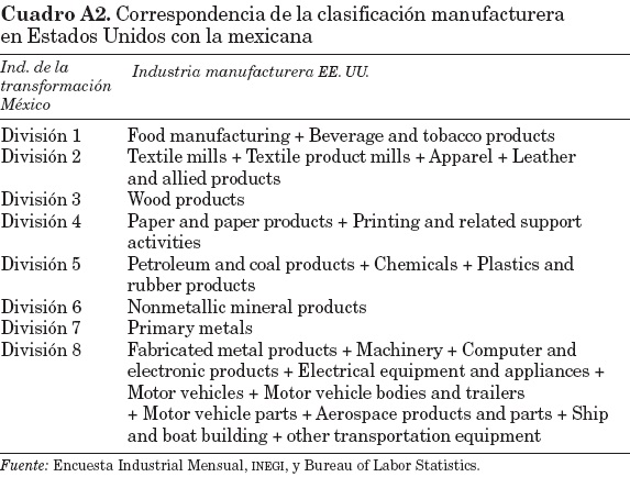 De esta forma, las primeras 8 divisiones de la industria de la transformación son la base para establecer las comparaciones de empleo a nivel de actividad económica entre los dos países.