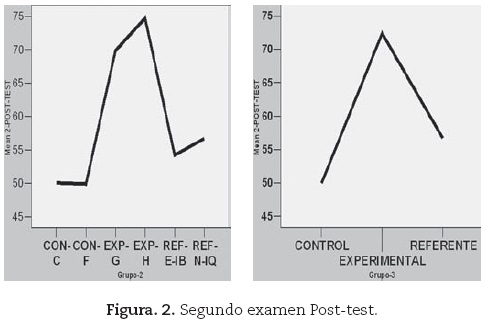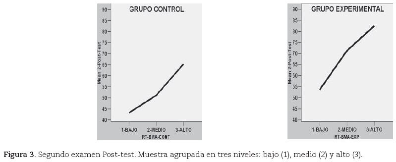 Se conoce la existencia de una correlación entre la habilidad para razonar del estudiante y el aprendizaje de la química. El análisis estadístico efectuado durante la investigación lo corrobora. Al comparar el rendimiento del alumno en función de su habilidad para razonar, se demostró que los estudiantes que siguieron el modelo didáctico alcanzaron mejores niveles de aprendizaje. Los resultados que se presentan en la tabla 6 revelan que los estudiantes que emplearon el manual pedagógico (grupo Experimental) tienen una media más alta que los que utilizaron el manual cotidiano (grupo Control), principalmente los del nivel 2 cuya diferencia es significativa. Esto también se aprecia en las gráficas de la figura 3.