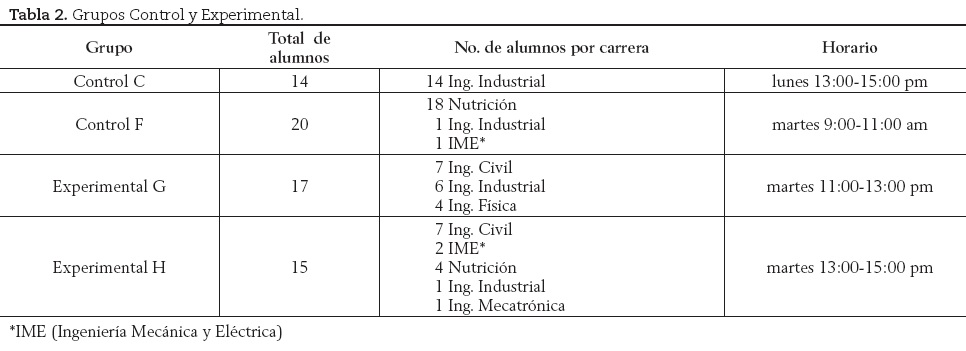 La población corresponde a los alumnos que cursaron el Laboratorio de Química General durante el periodo escolar de otoño-2004. Los sujetos estudiaban el primer semestre de carreras de las áreas de Ingeniería, y de Nutrición y Ciencias de los-Alimentos. La muestra estuvo formada por cuatro grupos con un mismo docente titular, dos participaron como grupo Control y dos como grupo Experimental (tabla. 2).