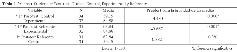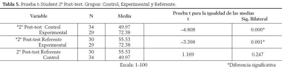 • Eficacia del modelo didáctico implementado. Contraste entre las medias de las variables 1er Post-Pre-test, 2o Post-Pretest, 1er Post-test, 2° Post-test, Pregunta No. 14, y Pregunta No. 5, para los grupos Control, Experimental y Referente.