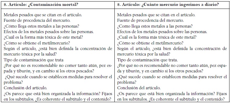 A continuación, en grupos de cuatro, respondían las mismas cuestiones para los dos artículos. Primero habían de pensar individualmente la respuesta y después la ponían en común para elaborar la tabla comparativa.