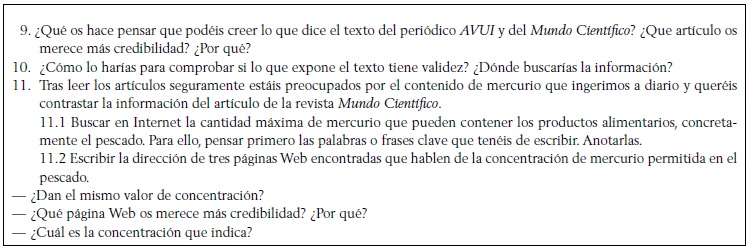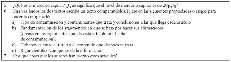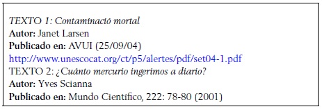 En esta actividad los alumnos tuvieron que leer dos artículos de fuentes diferentes para extraer información, compararla e identificar las diferencias y semejanzas entre los puntos de vista expresados. Los textos, uno periodístico y otro de divulgación científica, planteaban el problema del mercurio que ingerimos a través del pescado desde enfoques muy diferentes.