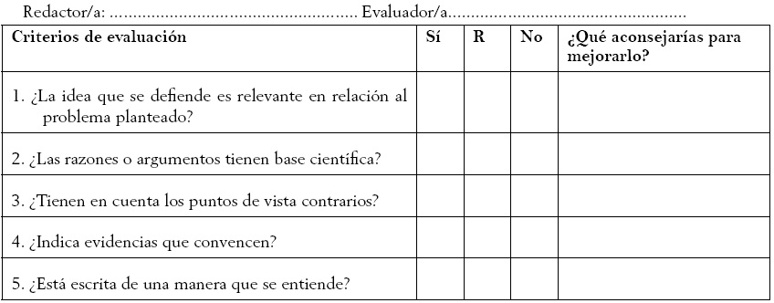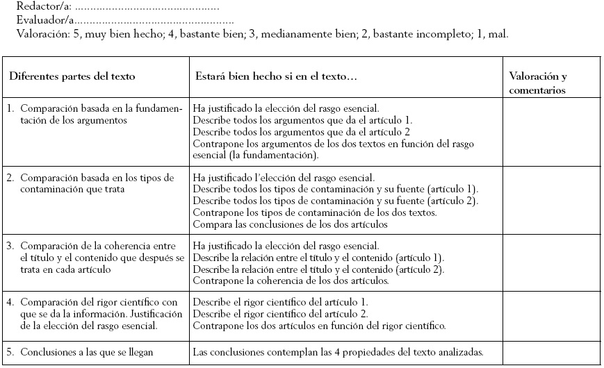 De esta pauta se pueden deducir criterios para evaluar la calidad del escrito propuesto y mejorarlo a partir de la co-evaluación entre los mismos alumnos:
