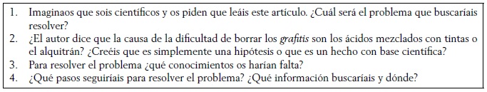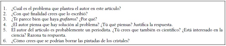 La lectura se dividió en siete partes. Cada alumno leía una y, en grupo, consensuaron el principal contenido de cada una de ellas (el problema, dificultades para la limpieza, soluciones, sanciones a los grafiteros...). Posteriormente respondieron individualmente al siguiente cuestionario: