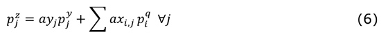donde axi,j: coeficiente de requerimiento del insumo de insumo intermedio iésimo para la unidad de producción del bien (exógeno) jésimo y ayj coeficiente del requerimiento de insumos de bien compuesto jésimo para una unidad de producción de un bien (exógeno) jésimo; y finalmente, el precio del producto interno bruto jésimo o costo unitario de producción