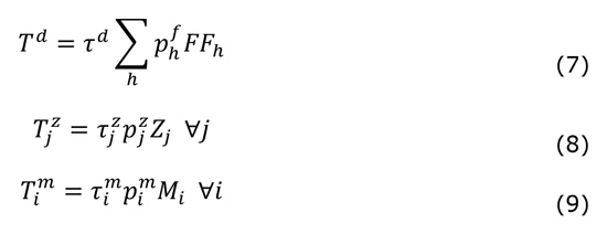 Las ecuaciones que siguen representan la política fiscal, donde se asume que el gobierno impone una tasa impositiva fija a los ingresos de los hogares (Ecuación 7), un impuesto ad valorem sobre la producción (Ecuación 8) y un arancel ad valorem al comercio internacional (Ecuación 9):