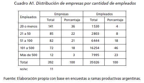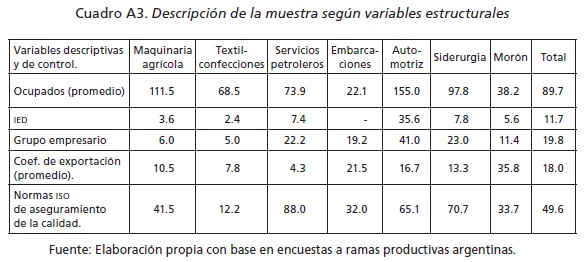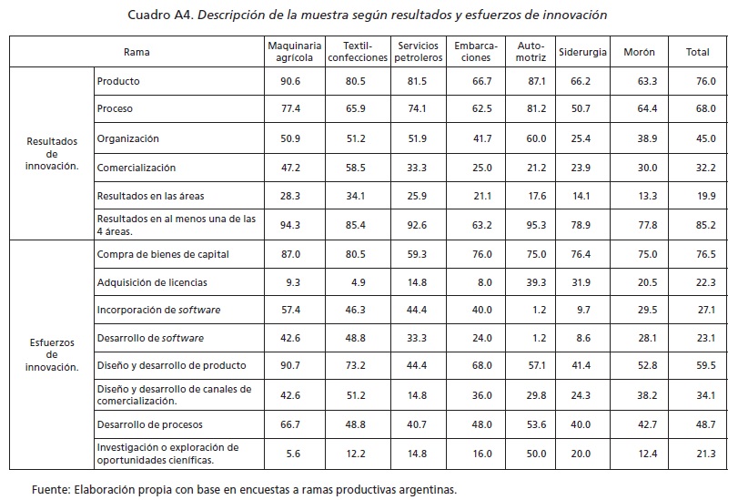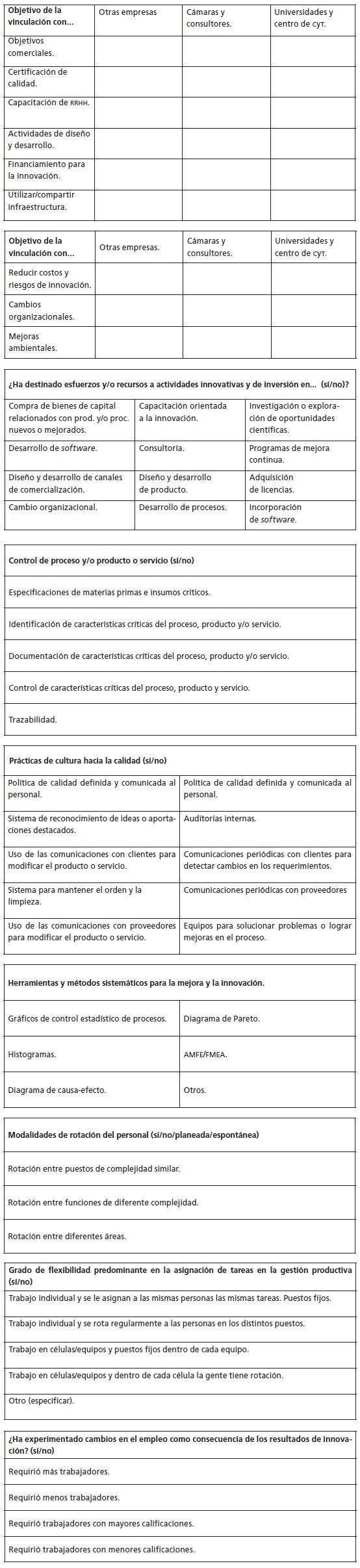 El cuestionario utilizado constó de cinco secciones. La primera indagaba datos generales de la empresa entrevistada (como tamaño, origen del capital, rama de actividad, etcétera); la segunda, las vinculaciones (extracomerciales) que establecía la empresa con otras organizaciones. La tercera sección estaba dedicada a la recolección de información sobre la conducta innovativa de las empresas, mientras que las secciones cuarta y quinta indagaban acerca de las formas de organización del trabajo y de las actividades de capacitación emprendidas por la empresa.