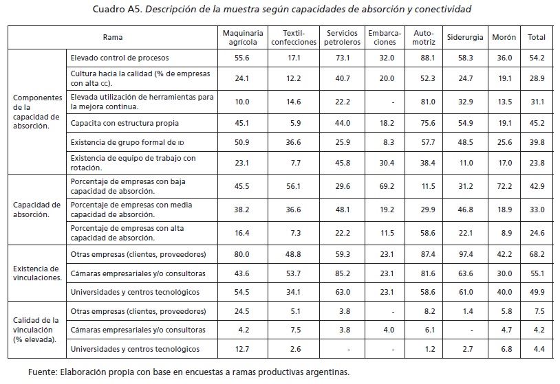 Los niveles de las capacidades de absorción y conectividad fueron definidos a partir de un conjunto de dimensiones que dan cuenta de las competencias de las empresas y de la calidad de las vinculaciones que éstas establecen con diferentes organizaciones pertenecientes a las ramas. El índice de capacidades de absorción es el promedio simple de cuatro indicadores: