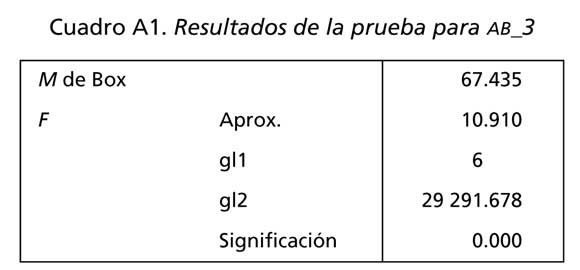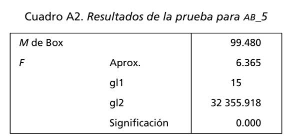 Uno de los supuestos del análisis discriminante es que las matrices de varianzas y covarianzas entre cada grupo son equivalentes. Con el fin de evaluar este supuesto, los cuadros A1 y A2 indican los resultados del estadístico M de Box, el cual tiene como hipótesis nula la igualdad entre matrices de covarianzas poblacionales entre ambos grupos. Los resultados indican que existe una diferencia significativa entre estos grupos. Sin embargo, Burns y Burns (2009) establecen que para muestras grandes un resultado como éste no es tan importante. Por lo tanto, continuamos con el análisis.