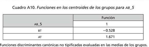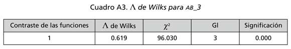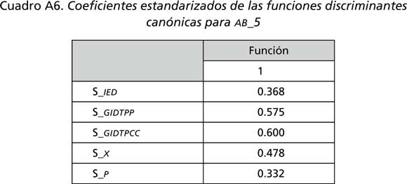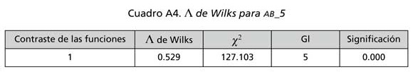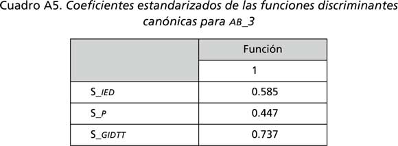 Con el fin de expresar una medida del ajuste de la función discriminante, los cuadros A3 y A4 muestran la Λ de Wilks, que indica el porcentaje de varianza no explicada por la función discriminante. De esta manera, el modelo con la clasificación industrial AB_3 explica 38.1% de la varianza de la variable independiente, mientras que el modelo para AB_5, 47.1%. Con el objetivo de conocer la significación estadística de la función discriminante, las últimas casillas de los cuadros A3 y A4 indican que la función es estadísticamente significativa.