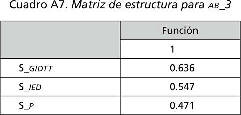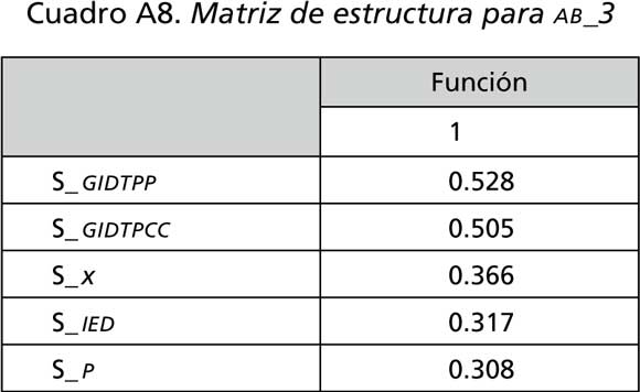 Además de los coeficientes estandarizados de la función de discriminante, existen los coeficientes de Pearson como indicador de la importancia relativa de las variables independientes para la ubicación de los individuos de estudio entre los grupos. Estos coeficientes muestran la correlación de cada variable con la función discriminante y se encuentran agrupados en la llamada matriz de estructura en los cuadros A7 y A8.