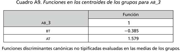 Un indicador que brinda evidencia de una separación de las clases industriales en los grupos AT y BT, con base en la función discriminante, es la comparación de los centroides o medias de los grupos de las variables independientes. En los cuadros A9 y A10 se puede apreciar que los centroides de las clases AT se encuentran relativamente separados del grupo de clases BT y con signos diferentes.