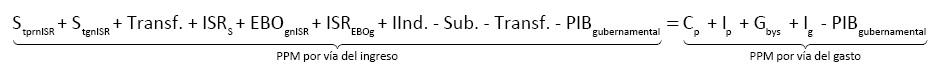Al igualar las mediciones por las vías del gasto y del ingreso, suponiendo que el comercio exterior está en equilibrio,21 es decir que X = M y descontando el PIBgubernamental de ambos lados de la igualdad, se obtiene la expresión que constituye el PPM, medido a través del ingreso y del gasto.