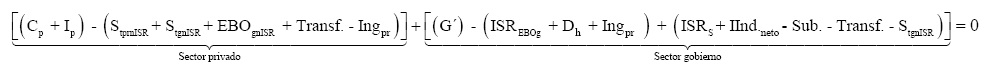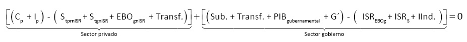 Los términos entre corchetes del lado izquierdo representan los gastos e ingresos del sector privado y los del lado derecho, los del sector gubernamental. Al interior de ambos sectores los términos se asocian mediante paréntesis en dos grupos: los que se encuentran del lado izquierdo del signo negativo representan los gastos o erogaciones de cada sector y los que se encuentran del lado derecho, los ingresos.