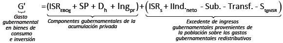 Ahora los gastos e ingresos del sector gobierno se han clasificado en tres grupos: El término entre paréntesis del lado izquierdo es el gasto gubernamental en bienes; los miembros a la derecha del signo negativo representan los tipos de financiamiento. De estos últimos, los términos del primer paréntesis constituyen los "Componentes gubernamentales de la Acumulación Privada"; los del último paréntesis, el "Excedente de ingresos gubernamentales provenientes de la población sobre los gastos gubernamentales redistributivos".