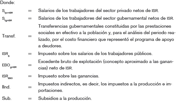 El PIBgubernamental se constituye fundamentalmente por los salarios brutos de los trabajadores gubernamentales, mientras que las remuneraciones con las que se adquieren los bienes de consumo son netas de ISR, por lo que Stgn|SR ≈ PIBgubernamental. Posteriormente, en la expresión contable anterior se sustituye el PIBgubernamental por Stgn|SR y de Ilnd. se deducen los derechos de hidrocarburos (Dh), que de acuerdo al SCN 1993 se registraban en ese rubro, y la categoría resultante se denominará Ilndneto.