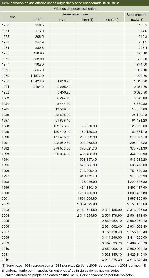 Encadenamiento de Series Históricas del Producto Interno Bruto de México y de las Remuneraciones de los Asalariados a precios corrientes 1970-2012