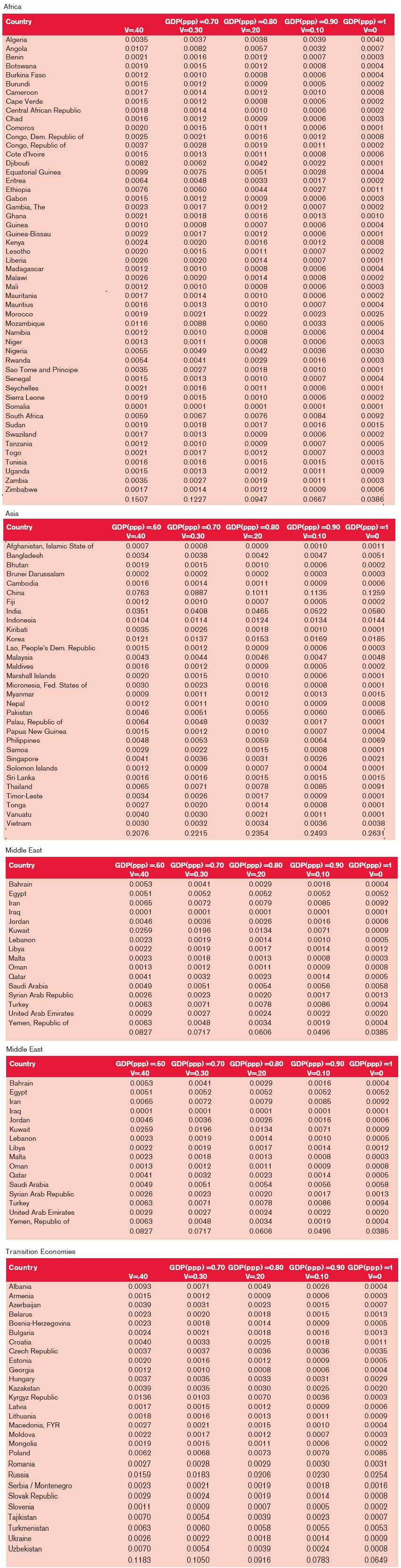Puesto que los ministros no han manifestado su opinión en cuanto a la proporción en que deberían combinarse estos factores, es decir, el peso relativo que ha de asignarse a ellos, en el cuadro que sigue se muestra la distribución de las cuotas por grupos de países que se obtendría asignando distintos pesos al PIB (PPA) y a la volatilidad, que van desde el PIB al 60% y la volatilidad a 40%, hasta el PIB a 100% y la volatilidad a 0 por ciento.