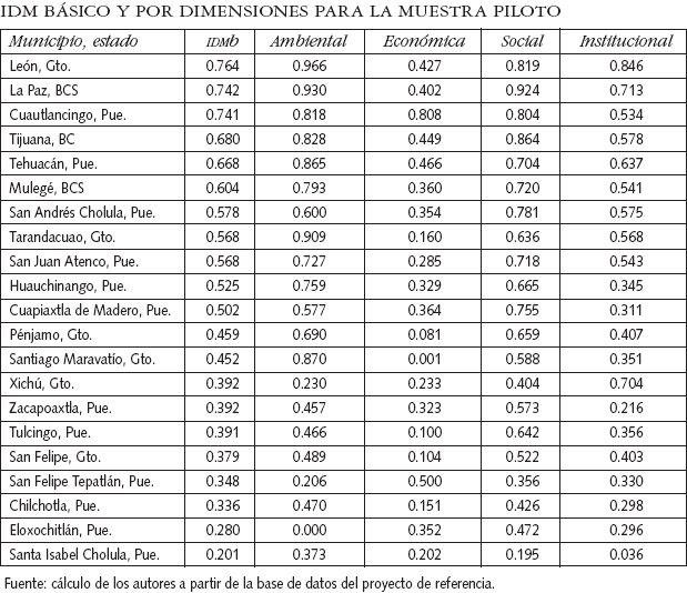 El IDMb y sus subíndices tienen valores de entre cero y uno, donde el valor uno representa el municipio con el mayor nivel de desarrollo de una muestra de referencia, y el valor cero corresponde a un municipio con el menor nivel de desarrollo de una muestra de referencia.