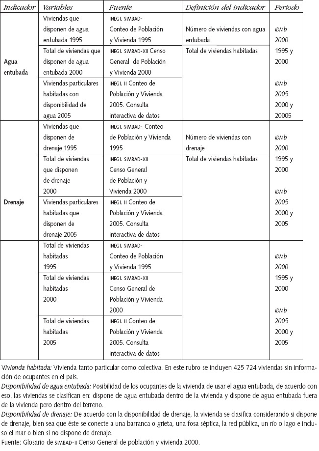 n es el número de observaciones disponibles en el periodo considerado, en el caso del indicador de disponibilidad de drenaje n=2, pues el promedio considera dos observaciones: 1995 y 2000 (IDMb 2000), 2000 y 2005 (IDMb 2005). En los casos en que un municipio no reporta información de uno de los periodos, el indicador sólo incluye el periodo del que existen datos.